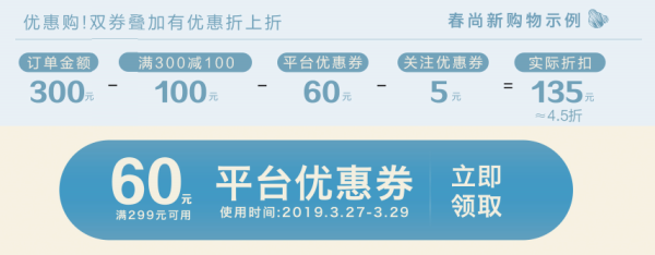 全场满300减100,叠加平台299-60元优惠券,再叠加5元关注优惠券,三重优惠。