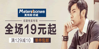 即日起至4月20日,一号店Metersbonwe美特斯邦威夏装特卖专场,全场19元起,满129元减10元,且全场单件包邮。活动页面商品多为衬衫、T恤、背心、裙子、牛仔裤等。