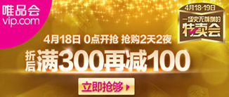 另外本次唯品会4月18日的大促销可以叠加我们正在发放的满300-30,200-20,100-100元的唯品会优惠券叠加使用。