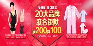 即日起至11月7日,苏宁易购孕婴童服饰床品,20大品牌联合促,活动商品全场满200元立减100元。活动品牌多多,包含:迪士尼、聪明谷、HelloKitty、婷美、贝贝利安、添香、爱家等。