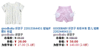 GOODBABY好孩子粉彩米奇婴儿T恤22024400751,GOODBABY好孩子女童吊带/背心22024403431,都参加好孩子60元选3件活动(促销优惠码T3P29APR),选3件参加活动后,可低至20元/件。真正的大牌低价,非常合算。GOODBABY好孩子粉彩世界妙妙装婴儿12302A081631,GOODBABY好孩子粉彩世界两件套连身衣婴儿12302A085911,参加99元2件活动(优惠码VUAHVP92),也是好价。