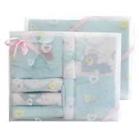 翻领套装一套(上衣+两用档),59码:适合3个月左右的宝宝;肩扣套装一套(上衣+开裆裤),59码:适合3个月左右的宝宝;防尿湿半被衫一件,52码:适合0-3个月的宝宝;背心一件,52码:适合0-3个月的宝宝;70cm*70cm抱被一条,抱被带一条,适合0-3个月宝宝;另:帽子1顶、方巾4条、防抓手套1双、脚套1双。