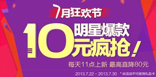 凡客诚品7月狂欢大促,爆款10元疯抢!多款女式T恤、连衣裙只要10元,很多款式都还有货,价格非常白菜!另外,还有情迷九宫格幸运翻转,和欢乐团团转包邮团活动。有兴趣的朋友可去看看。
