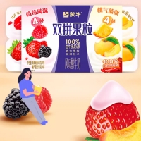 蒙牛双拼果粒,天生有实“超”,工艺不一般,实“粒”看得见,纯生牛乳奶源,自然醇香,优选牧场奶源,浓醇好品质,好新鲜,好营养,好美味~