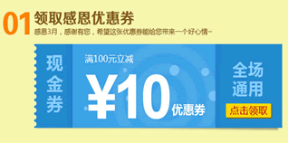 易迅网3月感恩回馈,满100-10元全场通用券免费领,领取优惠券的账号需注册满3个月,方可领取。优惠券全场通用,特价及虚拟商品除外。每人限领取一张优惠券。优惠券自领取之日3天内有效。