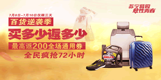7月8日-10日,苏宁易购百货逆袭季,买多少返多少全场通用券,高返200元券。参与条件和以往一样,需绑定手机,选择易付宝、网银支付、银联在线支付即可。