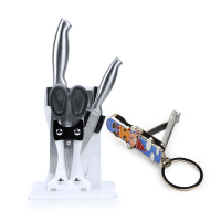 套组包含切片刀*1、水果刀*1、厨房剪*1、刀座*1,刀具全部采用的优质不锈钢制成,具有韧性、耐腐蚀、易清洗;剪刀还设计有异性齿轮,可用于开核桃;刀座则是以亚克力为原材料,设计上也甚有巧思的使用了天猫的黑猫图标,整体美观、大气又不失可爱气息。