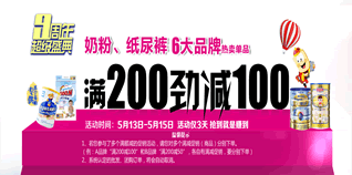 奶粉:购买指定奶粉满498减100元,满998减200元;纸尿裤:购买指定纸尿裤满199减40元,满299减60元,满399减80元;用品玩具:满199元减40元,满499元减120元,满999元减300元。 满减力度不错,订单结算时输入相应的促销优惠码即可。另还有特价优惠9.9元起,天天低价享不停。