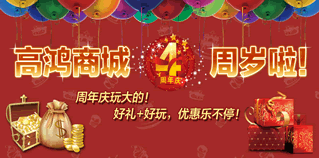 2013年12月2日-12月8日,高鸿商城4周年庆,好礼+好玩,优惠乐不停。周年庆活动内容多多,如:积分大抽奖、拍卖场、回忆城、127大卖场、手机充值、游乐场、限时等。