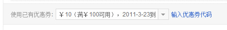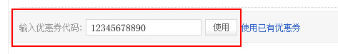(2) 输入优惠券代码成功之后,优惠券模块将自动切换到“使用已有优惠券”状态,并且显示该优惠券。注:优惠券将与账户绑定。