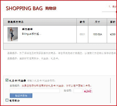 2. 前往购物车结算,在购物车中勾选“使用礼品卡”,在弹出框中输入优惠券密码,验证通过方可使用。