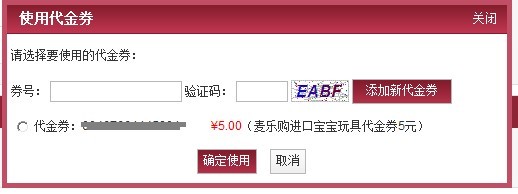 登录注册麦乐购母婴商城,选择您需要的商品,点击“立即购买”并“立即结算”在“确认订单信息”页面--“商品清单”--“使用代金券”输入您代金券的号码,并点击“确定”,若满足优惠券使用条件,系统将自动扣除相应的金额: