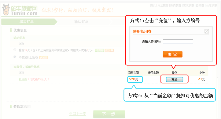 登陆注册途牛网,购买产品,在填写订单的时候输入途牛网优惠券