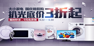 1号店国庆提前购,大小家电扒光底价3折起。每天6场限时、每天10点更新,商品0元免费领,还有限时,家电第二年免费坏即换新哦!活动还包括3C爆款专区、耍大牌、手快有手慢无大家电专区、小家电、手机、电脑、数码以及厨卫推荐专区。各类家电应有尽有,等你来挑选!