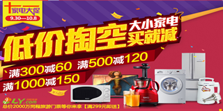 1号店大小家电专场,满300元减60元,满500元减120元,满1000元减150元,活动产品包括电视、电冰箱、电饭煲、微波炉、吸尘器、剃须刀等等,众多一线品牌都参与其中。此外,还有总价2000万的同程旅游门票等你来拿,满299元就能到手哦!活动截止日期为10月8日,亲们赶紧去看看吧!