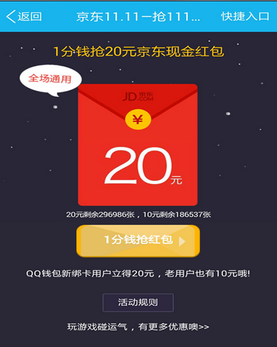 2、京东1分钱换全品类20-10或30-20元双11红包,需QQ钱包支付
