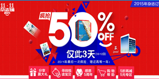 闲暇的时候,一本杂志、一杯咖啡是不是会让你觉得生活很惬意呢?双11这里小编要给喜欢看杂志的朋友送一点福利啦!杂志铺双11疯狂大促,2015年杂志5折订购!活动分为畅销杂志专区、热销杂志排行、育儿杂志、少儿阅读、旅游摄影、时尚杂志、财经杂志、文学杂志、学习辅导、生活百科以及新品推荐11个专区。除此之外,活动还特设5折再减5元专区、积分换好礼、感恩5周年以及寻找悦读宝贝的活动。除此之外,双11活动期间单笔订单金额500元以上者,可用订单编号后4位减去1111,所得值小者,有机会获得Ipad mini。推荐他人下单还可获得积分,推荐成功可获得卡通背包1个,推荐达人前5名,可获得荣事达咖啡机。