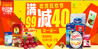 天猫年终盛宴,5大品类满减,热卖美食,满99减40,买一送一。活动页面专区有进口牛奶、饼干糕点、坚果炒货、糖果巧克力、方便速食、冲饮保健酒。商品满99减40元,还可叠加150减15、200减25优惠券,部分商品买一送一(不叠加满减)。年终盛惠每周活动均不相同,周为美食满减,第二周为米面粮油,活动力度不错,值得持续关注。遗憾的是狂潮已将商品洗劫一空,期待天猫的补货吧!