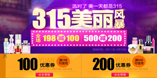 天天网315美丽风暴来袭,全场美妆满198减100、满500减200元!活动期间,入场即可领取满198-100、500-200元优惠券,先领券再购物,领用时间截止到3月16日。活动包括5个分会场,爆品满减专场,超多爆款美妆等你挑;品牌专场,欧美大牌、日韩潮牌、经典国货随你选;洗护专场,美体瘦身、洗护发产品一次囤够;魅力彩妆专场,底妆、眼妆、唇妆、卸妆一站搞定;春季保湿专场,解决你的饥渴肌!