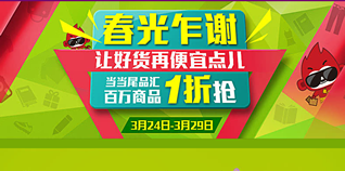 春光乍谢,让好货再便宜点儿。3月24日-3月29日,当当网尾品汇,百万商品1折起!活动主要分为:女装分会场、男装分会场、孕婴童分会场、内衣分会场、鞋靴分会场、居家生活分会场、运动分会场、皮包箱具分会场、手表眼镜分会场、珠宝饰品分会场、数码家电分会场、食品美妆分会场、图书分会场、童书分会场等14个分会场。各类大牌品牌1折起,还有满减优惠!如韩衣都舍满300-100元、妖精的口袋满300减50元、茵曼满199-50、美特斯邦威满199减30元、小猪班纳满299减50元、韩束满199减80元等等!大牌钜惠,精彩不停歇,还有更多专场和满减优惠等你发现!