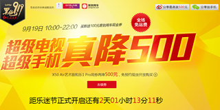乐视黑色919红色乐迷节,手机、电视直降500元,标准旗舰乐1999元!9月8日-9月18日期间,乐视商城举行红色乐迷节大促预热,所有人均可参与乐视产品的互动领券和1折活动。且9月19日当天的10点-22点,乐视品牌全系商品全部开放购买。乐视超级手机 1,原价1499元,大促当天999元!乐视超级电视原价2079元,大促当天1579元!且全场免运费!为增加趣味性乐视这次还增加了玩游戏赢豪礼活动,全年仅此1天,立即购买。