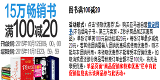 亚马逊图书优惠券大派送,满100减20元优惠券免费领!图书满100减20活动,活动期间内,在本页面领取优惠券后,购买指定的亚马逊自营图书(不包括电子书、第三方卖家商品,Z商品和Z实惠商品),单笔订单满100元在结账时系统将自动扣减20元。本活动开始时间:2015年10月12日09:00:00。结束时间:2015年11月1日23:59:59。