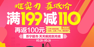 苏宁超市满199减110的活动,每天参与的品类也不一样,今天是粮油干货,除了满立减外,北京、上海、广州、南京四个城市的还能获得电器1000-100的返券。活动时间持续到本月31日。注意:商品有明显提价,注意比价,但是结合活动后还是有好价得!
