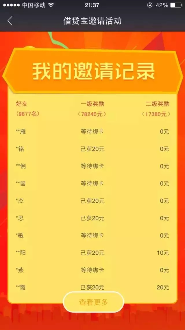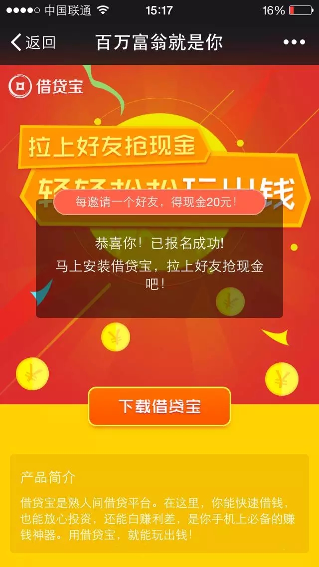 为什么借贷宝可以在短时间那么火,主要在于通过链接注册就送20元现金红包,红包可以即时提现到卡,瞬间吸引了很多人去下载。那又为什么那么多人去推广呢?因为A推广B去注册,A和B同时又可以获取20元现金。