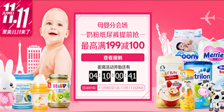 母婴分会场,奶粉纸尿裤优惠提前抢,全场满减优惠高满199元立减100元!除了奶粉、纸尿裤之外,还有宝宝辅食、洗护、玩具等母婴品类参与活动!活动时间目前尚未开始,将在11月8日正式开抢,现在可以入场抢先收藏!