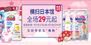 聚美优品母婴特卖专场,日本品牌特卖活动,全场29元起!聚美优品母婴专场开启了一个日本品牌特卖的专场促销活动,有纸尿裤、卫生巾、喂养清洁用品、儿童服装、玩具等,全场低只要29元。参与活动的品牌有花王、尤妮佳、大王、贝亲、TREBI、万代等,都是超低价格。活动截止到20号上午十点,有需要的可以看看。