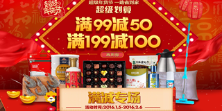 苏宁超市超级年货节,满99-50/满199-100元,10亿红包任性领!苏宁易购目前开启了超级年货节活动, 活动页面除了能够领取79-10、149-20、299-50和559-100的云券外,还有一个休闲食品类的满减专场。 专区一共是两个满减优惠,满99减50和满199减100,满减之后再用云券,能做到高99-60元的优惠哟!活动类目也比较的全,食品酒水、家居家纺、生活日用、粮油生鲜、个护美妆等等都有,前面小编也给大家介绍了京东、天猫、亚马逊、国美的年货节,不妨可以和苏宁超市的年货节来比比价!