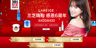 聚美优品301六周年庆,兰芝促销专场,免费领20-100元现金券,满420赠420!兰芝是小编比较喜欢的一个品牌了,东西非常好用,就是有点小贵。现在,聚美优品301促销,可以免费领20元无限制的优惠券、满499-50元现金券、满999-100元现金券,在消费满420元后还可赠送420元的大礼包。活动截止到今天23.-:59,平时舍不得买的MM们可以来下手了!