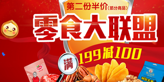 零食促销,需先在页面领取199-100优惠券,可用于蜜饯果干类零食,还有部分肉干肉脯零食也是可以使用的,吃货们不妨领券防身了,页面还有部分商品第二件半价,39.9元选10件。仅限3月9日~3月10日两天哦!另外还有个