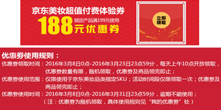 京东商城美妆超值付费体验区,抢满199减188元神券!京东的美妆超值神券,力度是199-188元,相当于花个12块钱买到199的超值单品,产品大部分是中小样,不过也是很划算的。此券从3月8日到3月23日,每天上午十点准时开抢,优惠券数量有限,随机领取,优惠券及商品领完为止。需注意的是,此券仅限使用于京东美妆品类制定SKU,活动时间段仅限领取一次!今天的已经领完了,小编觉得大家可以过来试下手气!