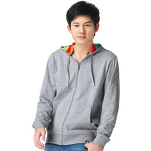 纯色带帽卫衣,简约时尚,彩色横条内衬,增添设计感,个性醒目。正适合现在的季节穿着。