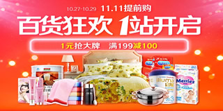 1号店双11提前购百货专场,1元抢大牌/满199减100元。1号店目前有个“百货狂欢,1站开启”的专场活动,力度为满199减100元,还可参加1元抢大牌的活动。