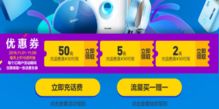 京东商城充值会场,抢满90-50/90-5/90-2的充值话费!京东商城目前有一场充值促销活动,十点抢话费优惠券,分别有满90-50/90-5/90-2的充值话费额度,估计满90-50的有点难抢,不过也可一试,活动时间为11.01-11.08,每天上午10点!有兴趣的朋友可以关注一下。