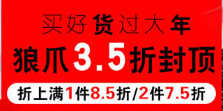 好乐买狼爪品牌户外专场,3.5折封顶,1件8.5折,2件7.5折。好乐买目前开启了一个狼爪品牌户外专场促销活动,活动力度为1件8.5折,2件7.5折,全场3.5折封顶。活动主要为男女户外运动服装、鞋靴等。这个季节,买点冲锋衣羽绒服什么的很合适,喜欢户外运动的朋友可以去逛逛!