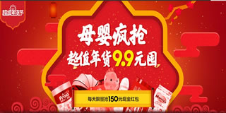 苏宁易购年货节母婴专场,超级年货低至9.9元,抢150元红包。苏宁易购开启了一个年货节母婴专场的促销活动,全场低至9.9元,每日可抢150元红包,自营洗护用品可用满199减100元优惠券,顺手把满69减5,满99减10元全品类优惠券领了。