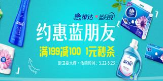 1号店清洁品牌联合专场,满199-100/99-30/1元。1号店于昨日开展了一个维达与蓝月亮联合促销专场,场内满199-100/99-30的力度,此外更有1元专区和特惠直降专区。