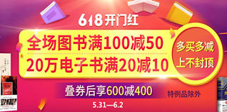 当当网618开门红多品类图书专场,高满600减400!当当现有618开门红多品类图书专场,之前给大家推荐过领满300减100元的优惠券(6月1日-6月2日10点,14点,20点共3波可以继续领取),今日活动正式生效,力度为每满100-50,叠加优惠券可做到600-400的好价!有需要的朋友可以看看!
