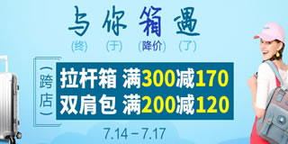 当当网与你箱遇箱包专促,拉杆箱满300-170/双肩包满200-120/满100-20券。当当网于7月14日开启了一个箱包促销专场,场内拉杆箱满300-170元,双肩包满200-120元,还有一张满100-20元的箱包通用券可领取。