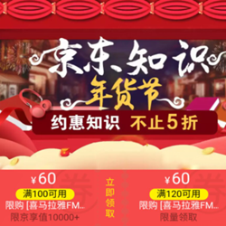 京东知识年货节,满100-60/120-60元!某东目前开启了主题为“知识年货节”的促销活动,主要涵盖的商品为在线课程类,包含了喜马拉雅FM、蜻蜓FM、核桃Live、豆瓣时间等平台的在线课程。