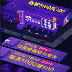 京东五星电器一站购,3日–6日购买家电产品可每满1000-100元,5日(明天)家电专场,爆款低价促销。