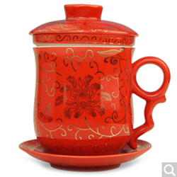 金镶玉陶瓷茶杯迎喜红四件杯 ,四件套包括杯身、内胆、杯盖、杯碟,规格:重量550g,容量300ml,茶杯高13cm,内径8cm。