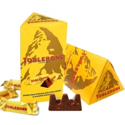 Toblerone瑞士三角进口牛奶巧克力,来自瑞士,因其独特的三棱柱造型,也被人称作瑞士三角。三角造型保证了强度,携带不易碎,同时掰块又很方便,口味也比较不错。相比常规巧克力瑞士三角添加了蜂蜜、巴旦木奶油糖和蛋清粉。