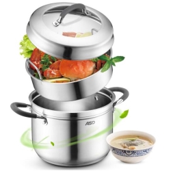 爱仕达304不锈钢一层复底蒸锅电磁炉燃气通用,采用304不锈钢,导热快速均匀,高效节能,不易划伤、发黄,坚固耐用,内置蒸屉。人性化加厚手柄,双重防烫隔热,舒适耐用。