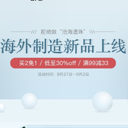 网易严选海外制造新品上线,买2免1/满99减33!网易严选海外会场特惠活动,折扣低至30% OFF(7折) ,部分活动商品参与 满99减33 的特惠,更有买2免1专区。活动持续至9月2日。