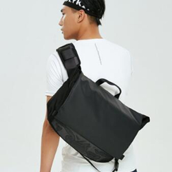 防水单肩信使包,外层使用的PU皮革面料耐磨耐撕,并且柔软轻薄,还具有的防水性能。整体容量为10L,可以放置14英寸以内的笔记本电脑、日常生活用品等。