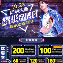 苏宁自营阿迪达斯超品日,领券每满400减200,高减600元,店铺优惠券60-180元。